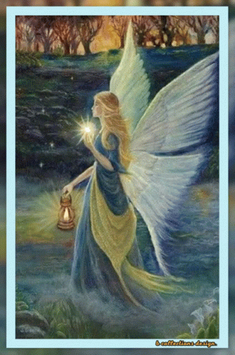 a painting of a woman with angel wings holding a lantern and a star