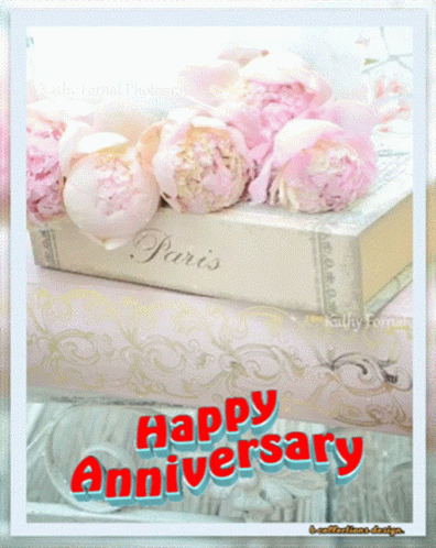 a happy anniversary card with flowers and a book