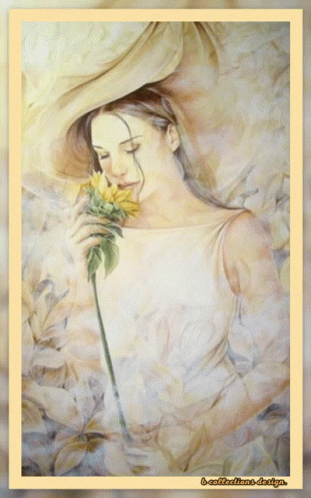a painting of a woman smelling a flower with the words l' ecollectione design on the bottom right
