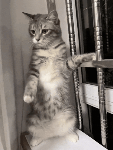 a cat standing on its hind legs next to a window
