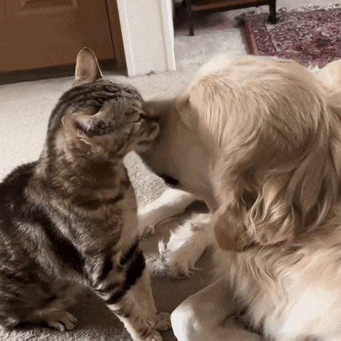 a cat and a dog looking at each other