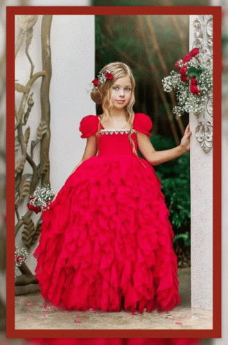 a little girl in a red dress with ruffles is standing next to a wall