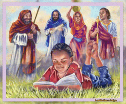 a painting of a boy laying in the grass reading a book surrounded by other people