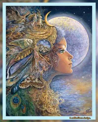 a painting of a woman with a peacock feather on her head and a moon in the background
