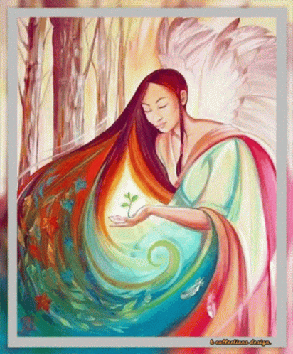 a colorful painting of a woman holding a small plant