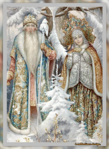 a painting of a man and a woman standing next to a snowy tree