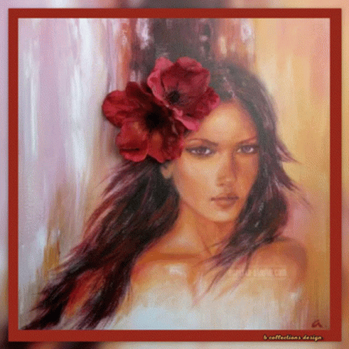 a painting of a woman with a red flower in her hair has a red border