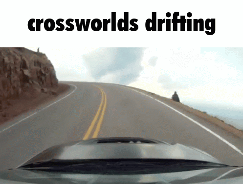 a car driving down a road with the words crossworlds drifting above it
