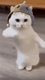 a white cat wearing a shark hat is standing on its hind legs and giving a thumbs up .