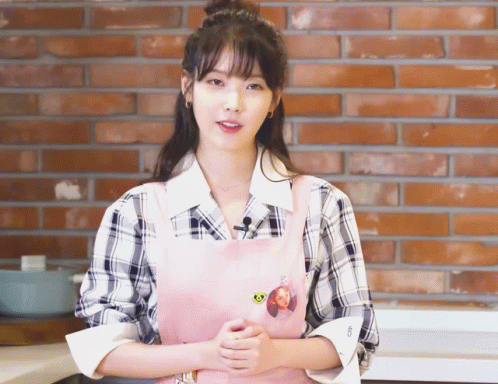 a woman wearing a plaid shirt and a pink apron stands in front of a brick wall ..