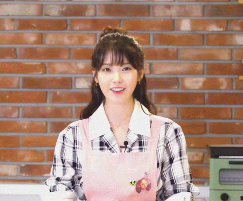 a woman wearing a pink apron and plaid shirt is smiling in front of a brick wall