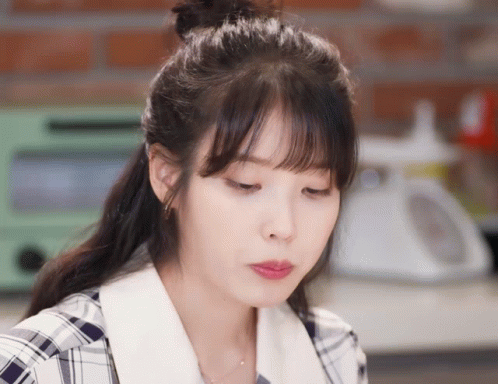a woman in a plaid shirt is looking down with her eyes closed
