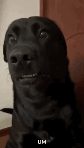 a close up of a black dog making a funny face