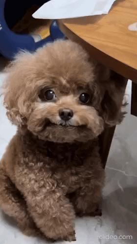 a small brown poodle is sitting in front of a wooden table and looking at the camera .