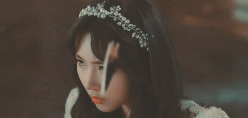 a close up of a woman wearing a headband with pearls