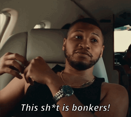 a man wearing a watch is sitting in a car and says this sh*t is bonkers