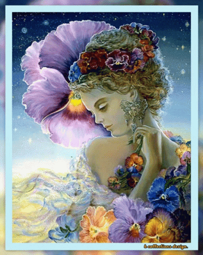 a painting of a woman with flowers in her hair and a purple flower on her head