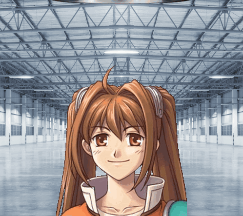 a girl with pigtails is smiling in front of a large building