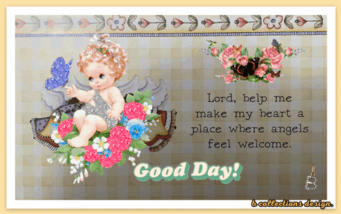 a greeting card with a baby angel and flowers says good day