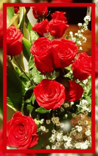 a bunch of red roses with a red frame