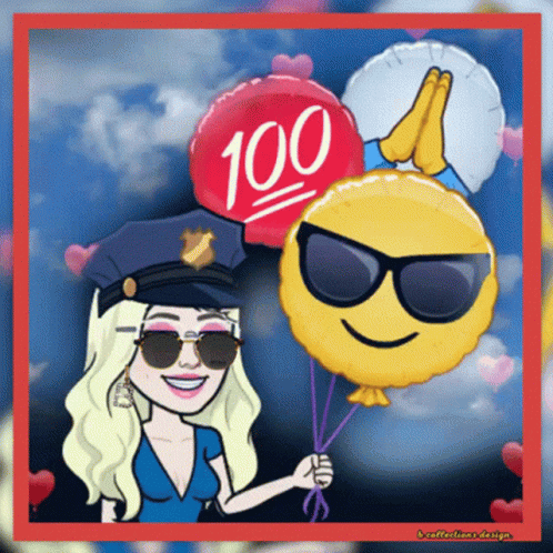 a woman in a police hat is holding balloons that say 100 on them