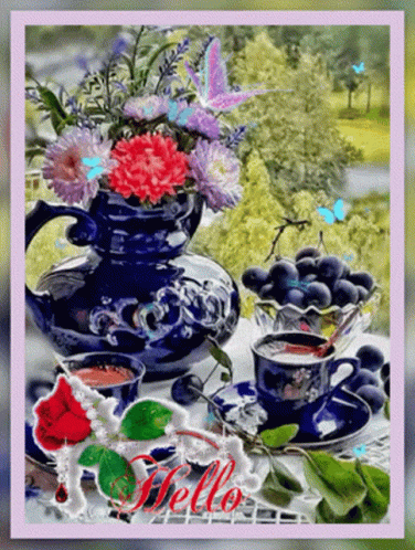 a bouquet of flowers in a blue vase sits on a table next to two cups of tea