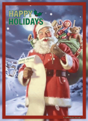 a christmas card with santa holding a list and the words happy holidays on the top