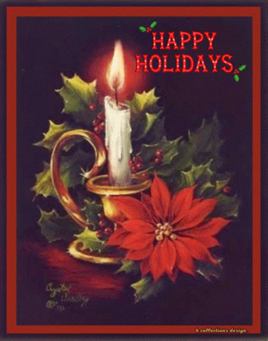 a christmas card with a poinsettia and a candle and the words happy holidays