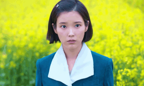 a woman wearing a blue jacket and white collar is standing in front of a field of yellow flowers