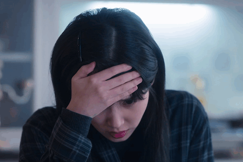 a woman in a plaid shirt is holding her head with her hand