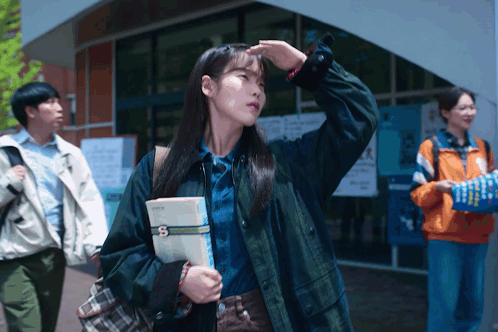 a woman in a green jacket is holding a book with the number 8 on it