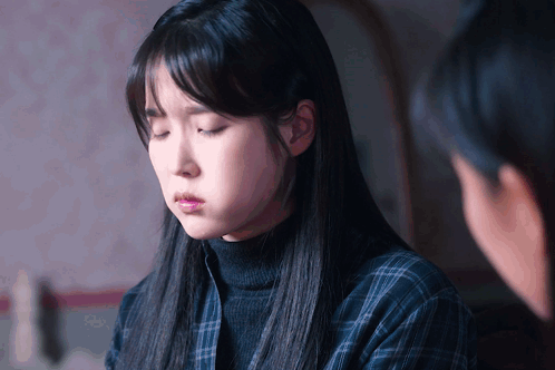 a woman in a plaid shirt is looking down