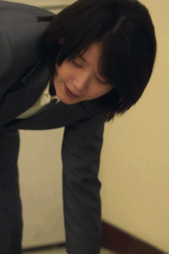 a woman in a suit and tie is bending over with her eyes closed