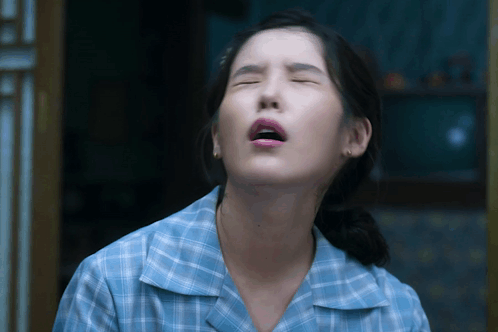 a woman in a blue plaid shirt with her mouth open