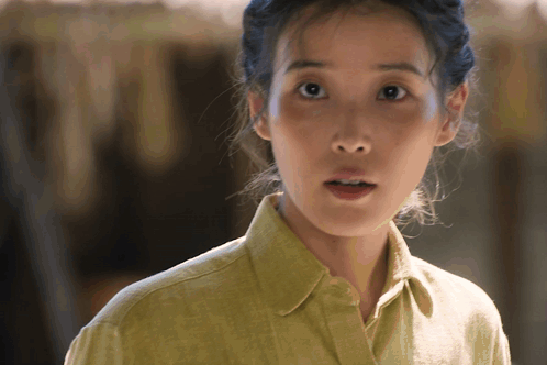 a woman with a surprised look on her face wearing a yellow shirt