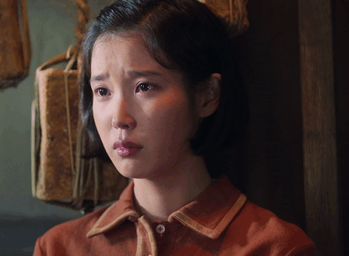 a woman in a red shirt has a sad look on her face