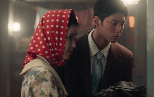 a man in a suit and tie stands next to a woman wearing a red polka dot scarf