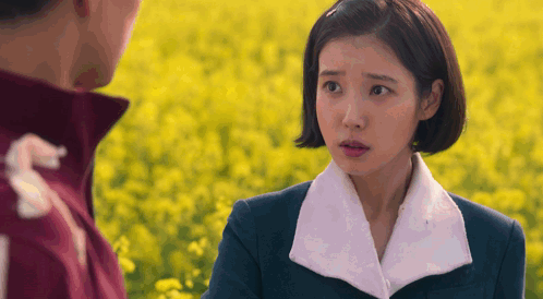 a woman in a blue jacket stands in front of a field of yellow flowers looking at a man
