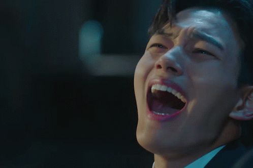 a close up of a man laughing with his mouth open