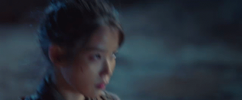 a person is walking down a street at night with a blue light behind them