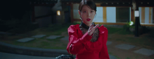 a woman in a red dress and black lace top is holding a knife .