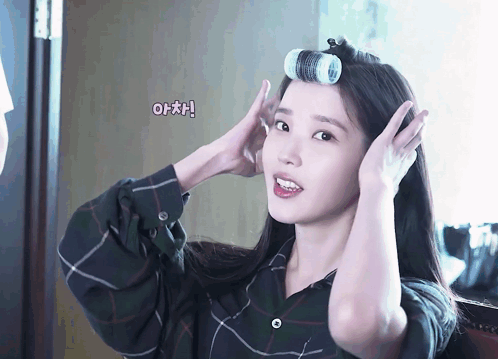 a woman with curlers in her hair has a sign above her that says ohh