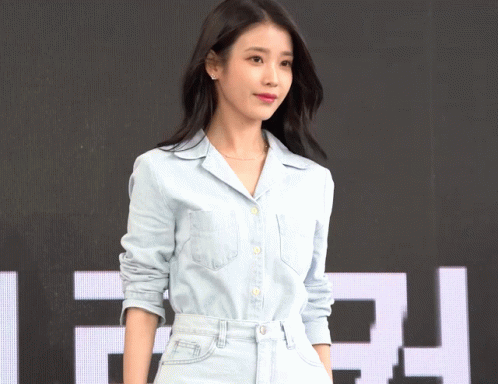 a woman in a denim shirt is standing in front of a sign that says ' r ' on it