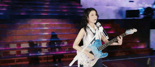 a woman is playing a guitar and singing into a microphone while standing on a stage with stairs in the background