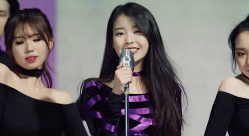 a woman singing into a microphone with a purple striped top