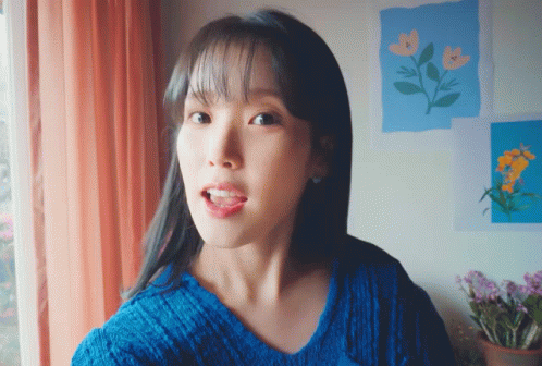 a woman wearing a blue sweater is looking at the camera