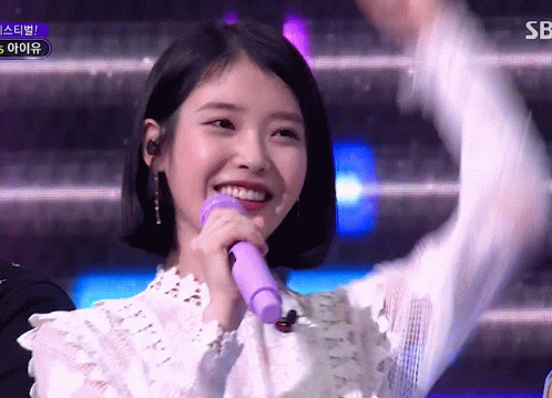 a woman singing into a purple microphone with sb on the bottom right