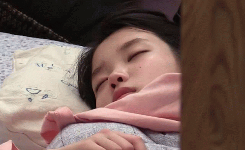 a young girl is sleeping on a bed with a pillow that says ' a ' on it