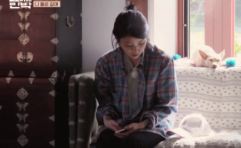 a woman sits on a couch looking at her phone with a dog laying on the window sill behind her