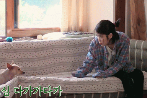 a woman sits on a couch playing with a small dog with korean writing on the couch